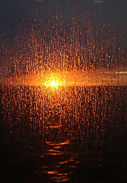 Droplets of water in the window of a boat to Camiguin Island, Philippines, highlighted by the falling sun…
