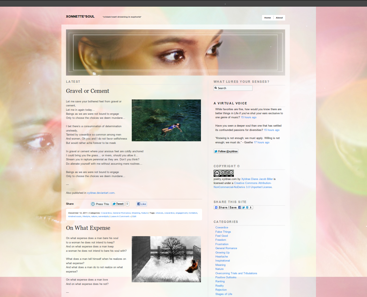 I have decided to finally make a separate blog solely for my poetry and the poetry of those close to my soul. It’s all there in Xonnette*Soul… Be mused…